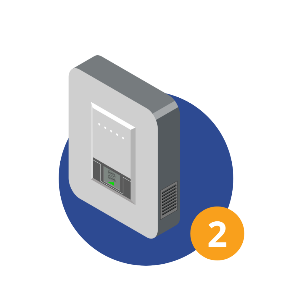 O inversor converte a energia gerada de corrente contínua (CC) para corrente alternada (CA) que é o padrão da rede elétrica. Assim, a energia torna-se imediatamente disponível para consumo.